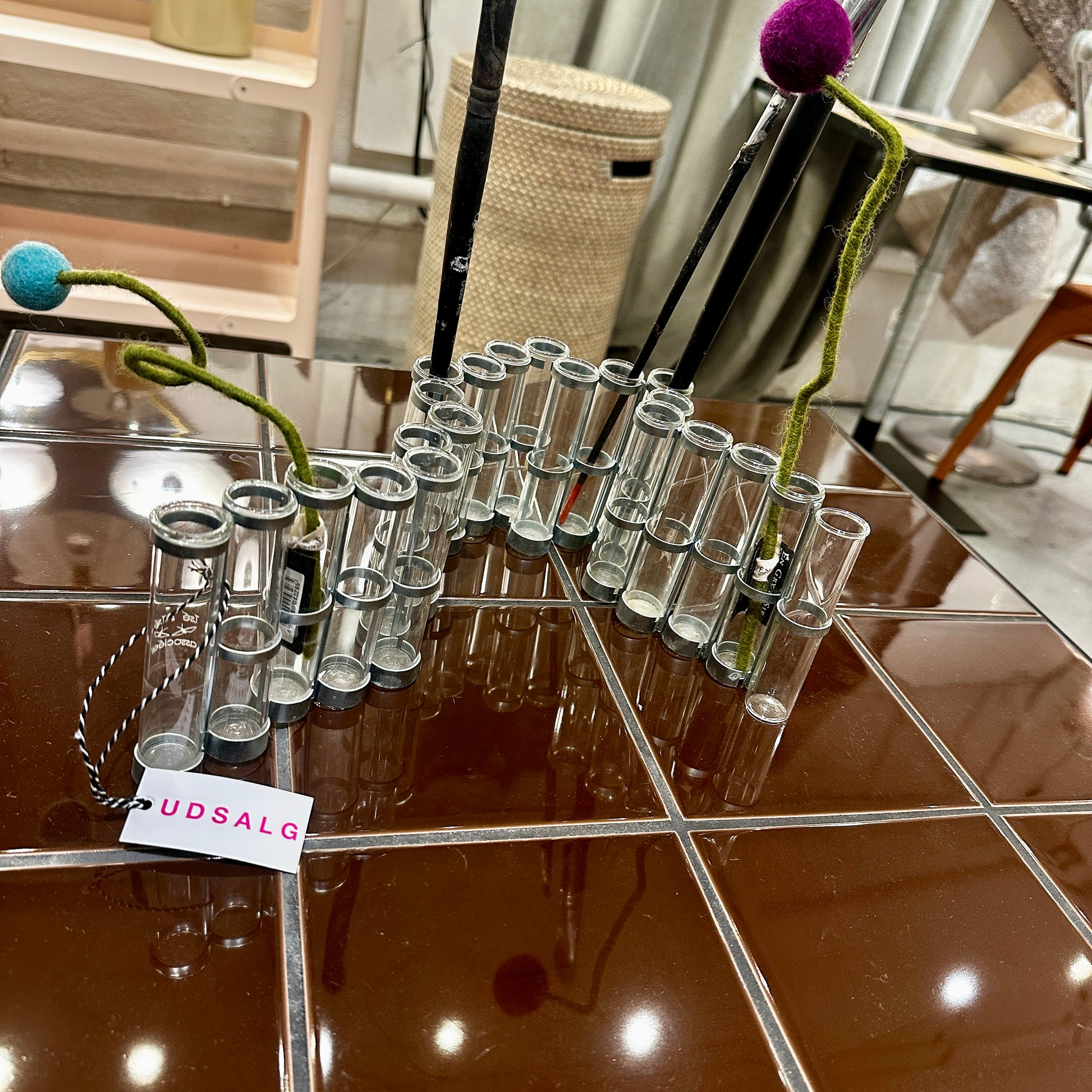 21 små vaser på række. Kan også bruges til opbevaring af pensler, blyanter og andet godt.