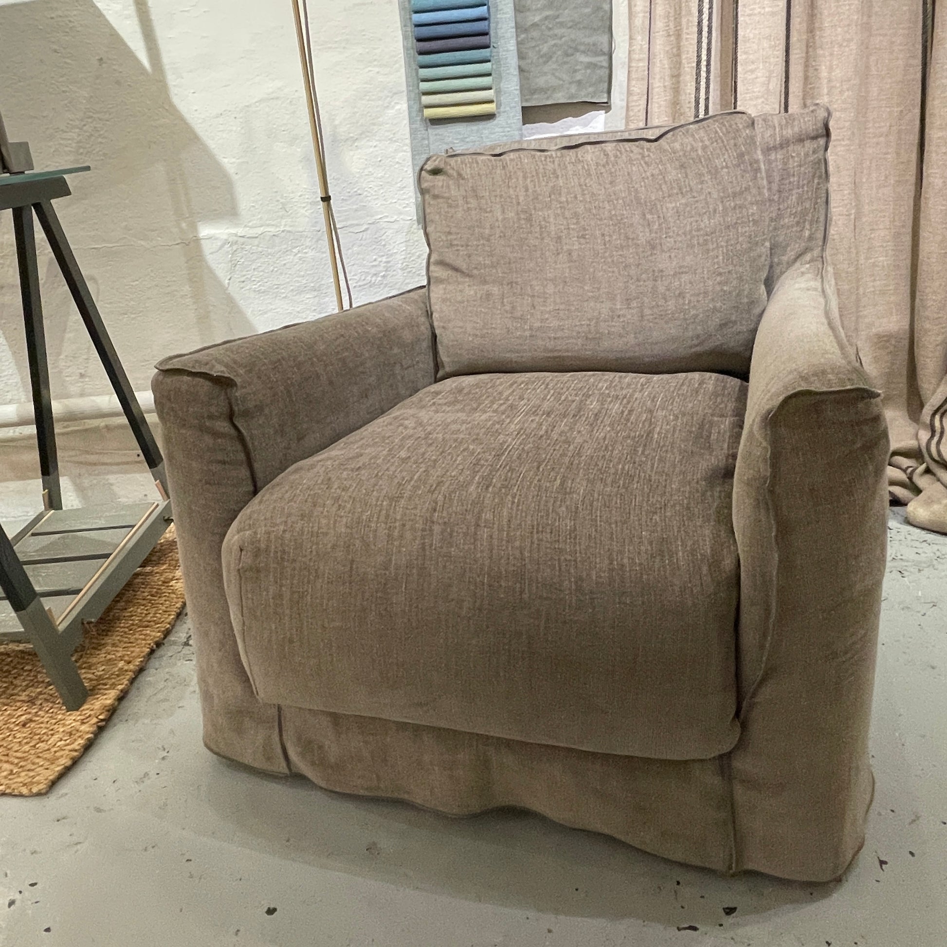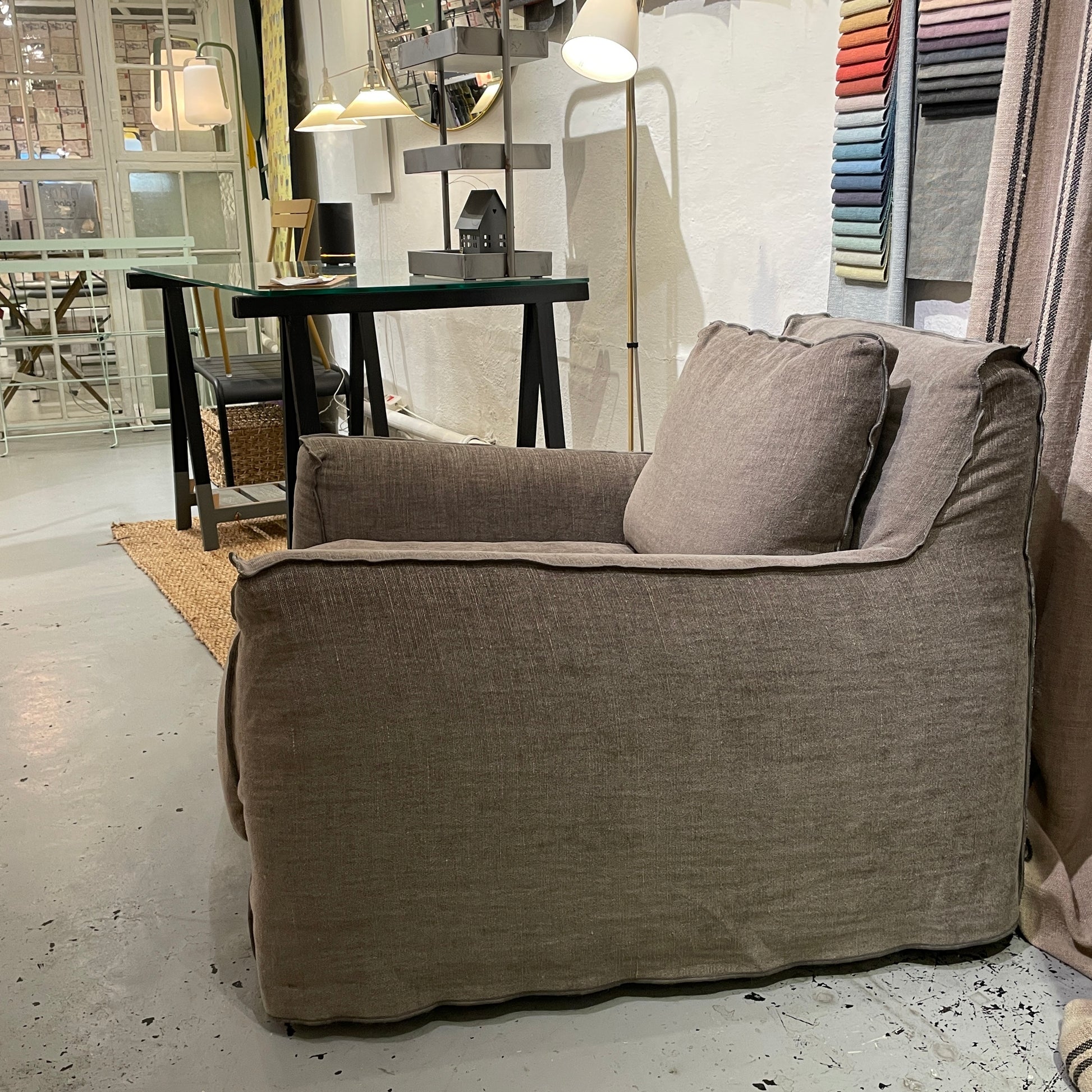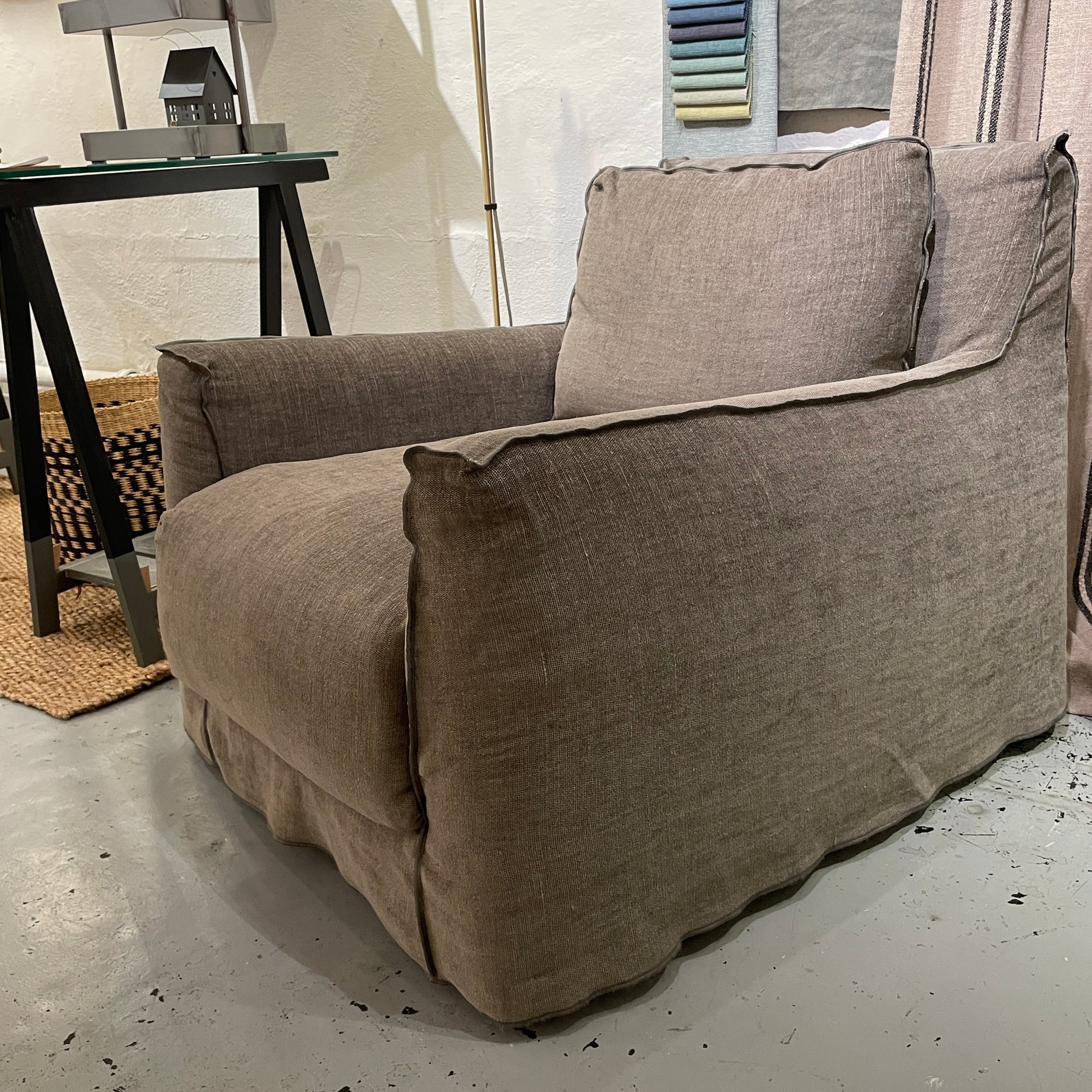 Gervasoni Loll 05 Lænestol. Designet af Paola Navone for italienske Gervasoni. Opbygget med trækonstruktion i flere lag og med polyurethan skum og dun. Loll 05 stol har et blødt sæde. Aftageligt løst betræk med skørt. Mulighed for flere stoftyper og farver samt "piping" syning.
