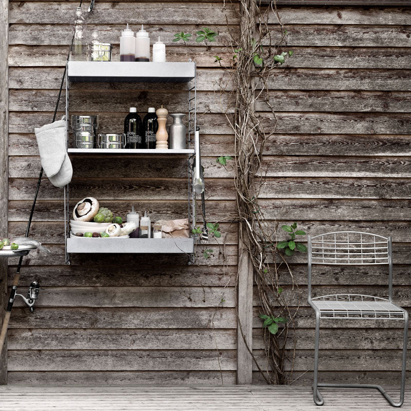 String Outdoor serien modulsytem af reoler og opvarings løsninger, der kan holde til udelivet og som samtidigt er smukt at kigge på. Strings Outdoor reoler kan selvfølgelig suppleres med flere moduler og ophængs kroge.